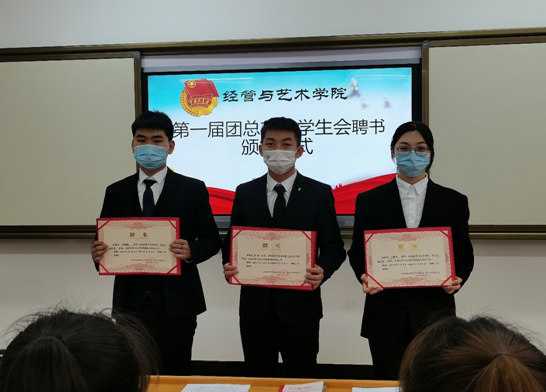2022年4月12日下午14:00,经管与艺术公司第一届团总支、员工会干部聘书颁发仪式在第二教学楼105教室顺利举行,仪式由员工会主席张豪主持。