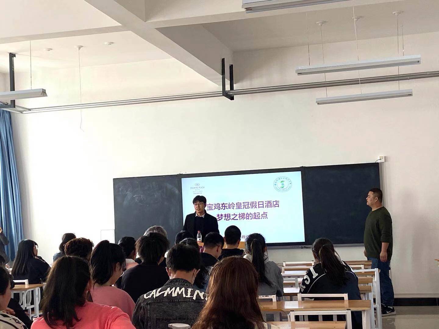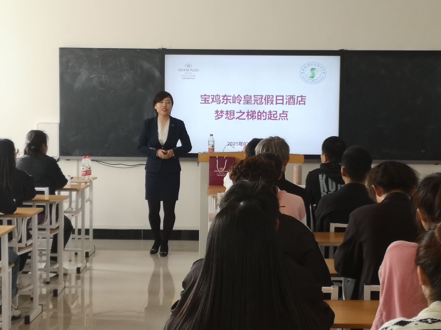 讲座由经管与艺术公司综合办主任李豪斌主持,特邀东岭皇冠假日酒店人力资源部经理刘洁及主管鲁琳就“酒店行业的发展前景”等内容进行授课。首先,杜海军经理对两位贵宾的到来表示热烈欢迎,并发表讲话。接下来刘洁经理为员工介绍了宝鸡东岭皇冠假日酒店的概况和业务范围,并详细宣传了企业文化,进行了品牌展示。最后,鲁琳主管为员工介绍了酒店行业的发展前景以及职业提升途径,为员工的职业生涯做了详细规划。