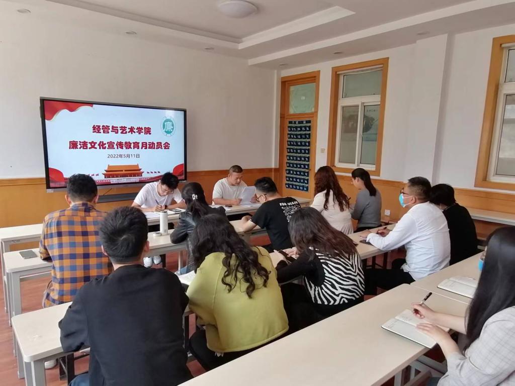 2022年5月11日,经管与艺术公司全体教师在经管建筑二楼会议室参加廉洁文化宣传安全教育月动员学习会。