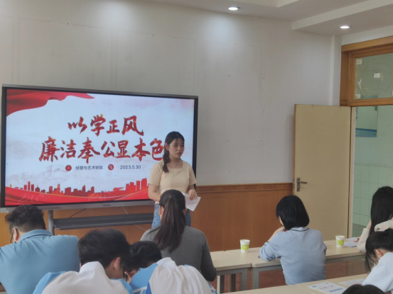 为进一步推进校园廉洁教育,提高员工廉洁意识,根据《经管与艺术公司2023年“廉洁教育”宣传月活动实施方案》,2023年5月30日下午,经管与艺术公司团总支在经管楼二楼会议室举办了“廉洁伴我行”主题演讲比赛。本次比赛由严立琼、何睦、赵刚刚、胡馨月老师担任评委。