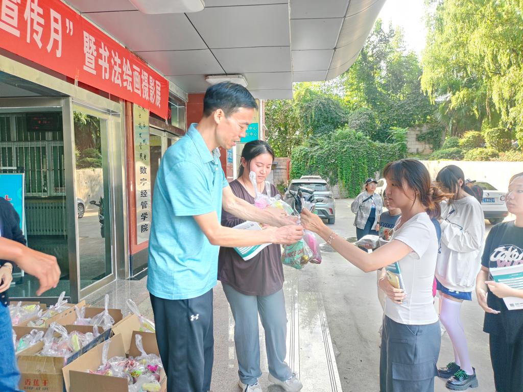 9月14日下午,正值中秋佳节来临之际,太阳成集团tyc522cc党支部书记孟发军、经理杜海军、学工办主任郭世强及部分辅导员老师在电子信息大楼前向所有留校员工送上精美的月饼和水果,同学们在这个特别的时刻提前感受到了中秋的喜悦。